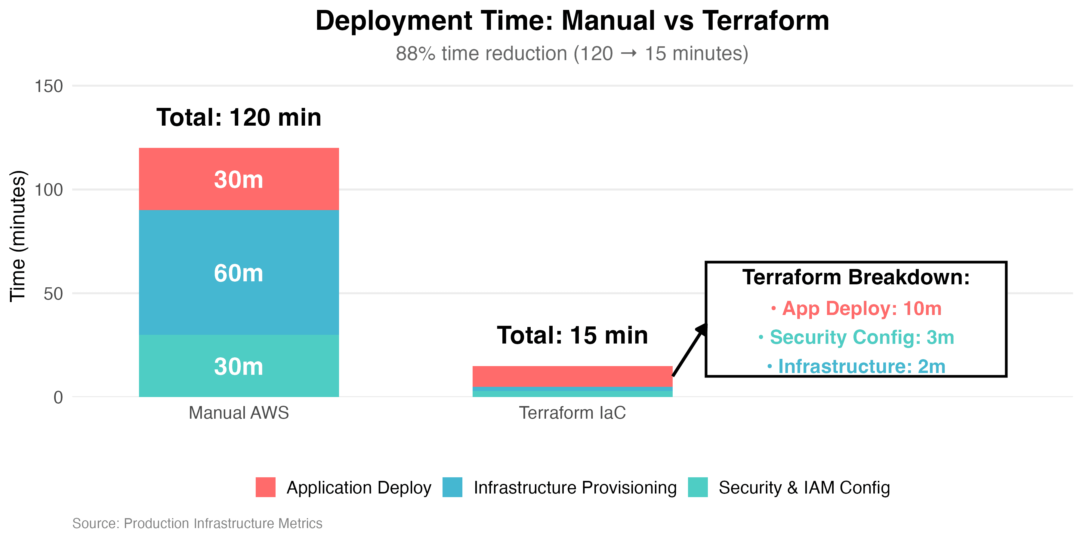- Infrastructure deployment: 2 hours → 15 minutes (88% reduction)